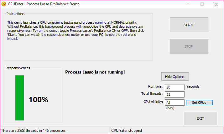 There are different benchmarks you can set up inside this app. Most notably, you can use Process Lasso’s Pro Balance benchmark to detect and test your CPU under high usage levels.